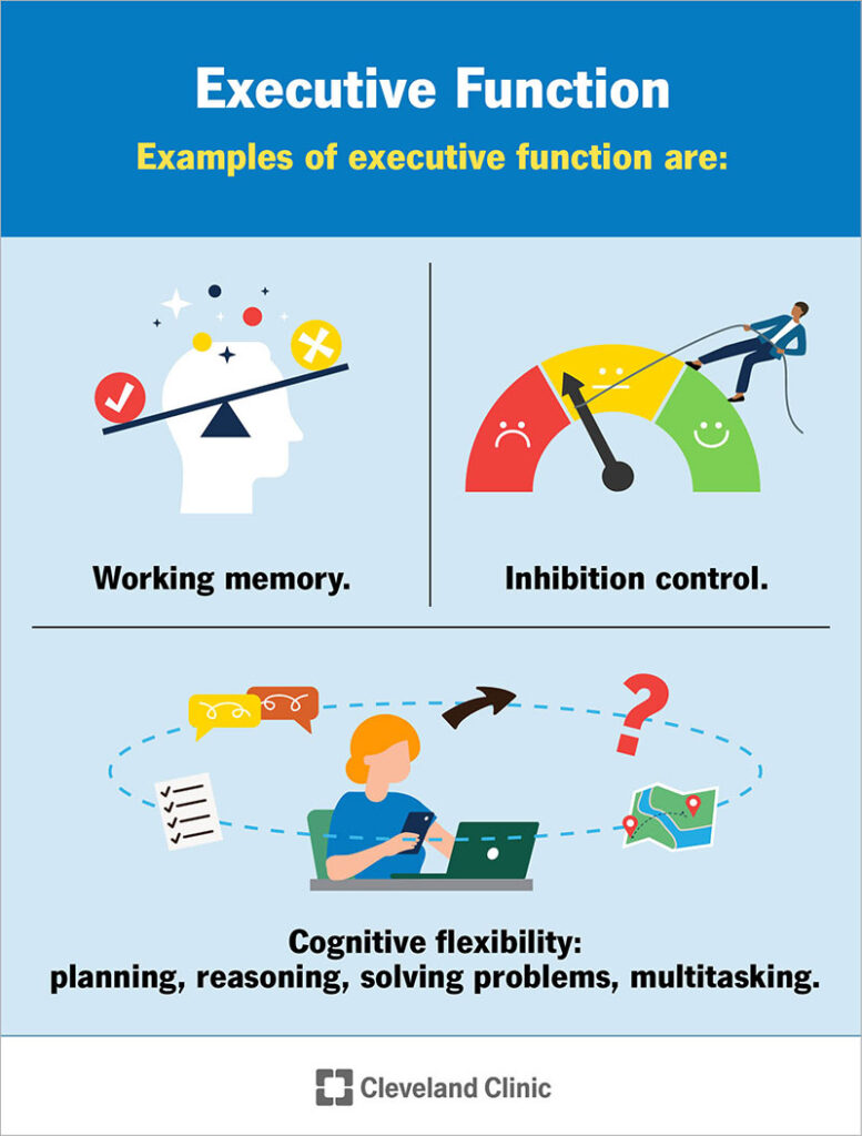 1). Executive functions are a set of skills processed in the prefrontal cortex that allow us to think, set goals, plan, organize, and follow through to achieve those goals. The three main functions that are considered to be executive functions are impulse or inhibitory control, working memory, and cognitive flexibility.